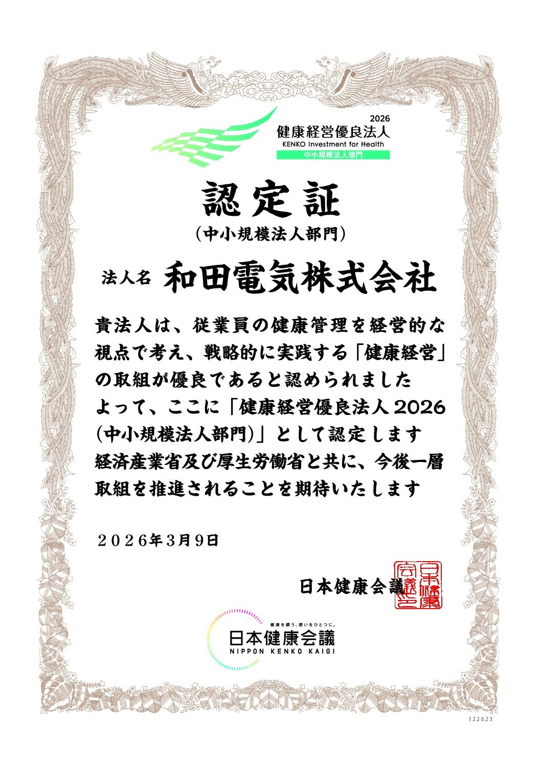 和田電気株式会社は、経済産業省が創設し、日本健康会議が認定する「健康経営優良法人認定制度」において、